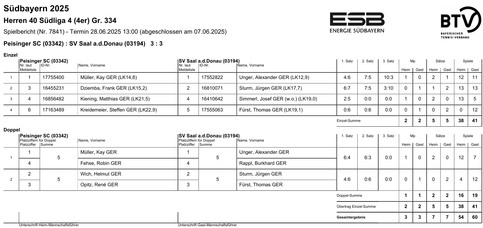 | Fischer/Radspieler | 7:5 | 3:6 | 10:8 | 1:0 | 2:1 | 11:11 | Müller/Opitz |
