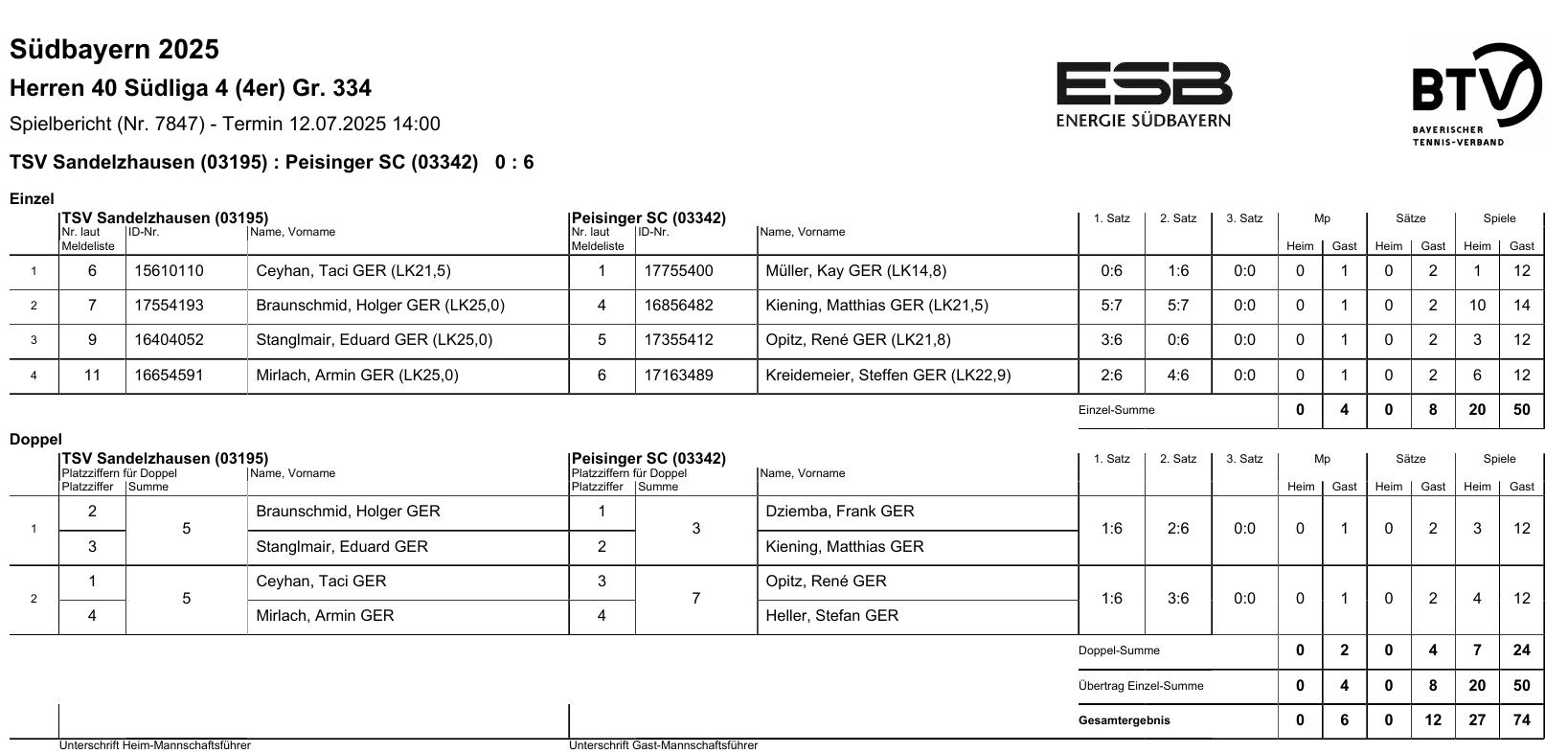 | TSV Sandelzhausen | S1 | S2 | S3 | MP | SÄ | SP | Peisinger SC |